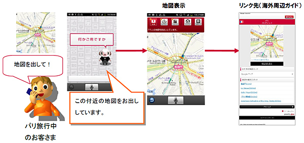 24都市のレストランやショップ、美術館などの観光スポット、21都市の地図、100都市以上の週間天気予報の回答ができるようになる。例えば、ロンドンで「近くのカフェは? 」、韓国で「焼肉が食べたい」など、知りたい内容をスマートフォンに話しかけると、位置情報とドコモが提供するエリアガイドを組み合わせて最適な検索結果を回答する。