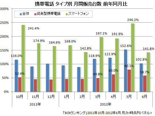 「BCNランキング」によると、2012年6月のスマートフォンの販売台数は前年同月比141.8%と、ここ数か月の間では低い水準だが前年を上回った。対して、従来型の携帯電話は前年同月比58.7%にとどまり、前年割れの状況が続いている。