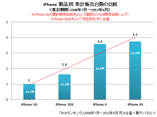 家電量販店の実売データを集計した「BCNランキング」によると、日本で最も売れたスマートフォンは、2011年8月末の時点ではアップルの「iPhone 4」だった。その後継機種「iPhone 4S」も人気を集め、特に2011年10月14日の発売直後は、他の機種とはケタ違いの驚異的な売れ行きを記録した。「iPhone 4S」は、2012年に入っても売れ続け、6月17日には、ついに「iPhone 4」の累計販売台数を抜いた。とはいえ、iPhone 4/3GS/3Gからの機種変更も多いとみられ、発売から約8か月というスピードは、取り扱いキャリアが従来の1社から2社に増えた割には時間がかかったといえるかもしれない。