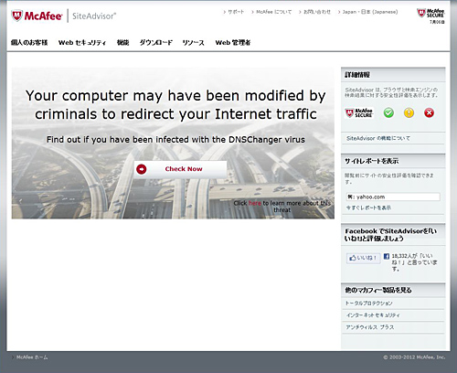 マカフィーは、7月5日、PCがトロイの木馬の一種「DNS Changer」に感染しているかどうかを診断するウェブサイトを開設した。診断の結果、感染していた場合は、インターネット設定を修復するソリューションツールを無料でダウンロードできる。