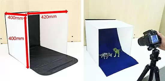 約40cm四方のブース。フィギュアやプラモデルなど小物の撮影に適しており、自宅で気軽にミニスタジオをつくることができる。ブログやウェブページ作成、オークション出品など、頻繁に商品写真の撮影をする人に最適だ。