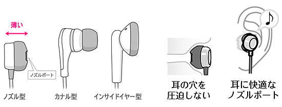 耳の穴に圧迫感がない独自のノズルポートを採用したイヤホン。耳の穴に挿し込まない形状なので圧迫感がなく、カナル型が苦手な人でも快適に装着できる。
