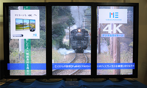 「デジタルサイネージジャパン」に参考出品された「HDSS-4K」。縦置きにした3枚のフルHDパネルでデモを行っていた。4K動画に加えて、テロップもスムーズに流れていく
