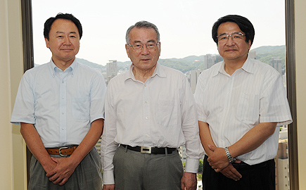 左から高溝與志夫社長、藤原睦朗会長、開発・技術本部の中田潤ハードウェア担当部長