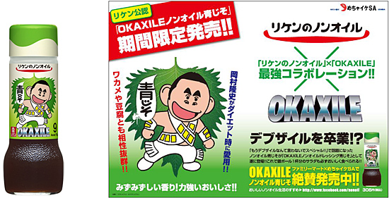 「OKAXILE」は、フジテレビのバラエティ番組「めちゃ×2イケてるッ!」の企画で行われた岡村隆史さんとボーカル&ダンスグループEXILEのコラボレーションユニット。今回、「OKAXILE」と「リケンのノンオイル青じそ」がコラボレーションした「OKAXILE ノンオイルドレッシング青じそ」を、「お台場合衆国2012」会場の「ファミリーマート×めちゃイケSA」「サンサンアイランド内 オカザイルSHOP」とフジテレビショップで発売する。