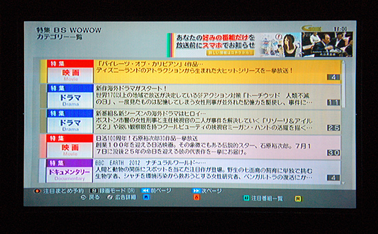 また、最長で60日先までの放送予定表を表示する「1カ月番組表」(WOWOW/スターチャンネル)や、各局が目玉番組として力を入れる番組情報を最長で32日先まで紹介する「注目番組」を提供。1週間以上の長期出張などのときにもしっかり録画予約をすることができる。さらに、NHKやWOWOW、スターチャンネルのテレビ情報誌の特集記事と連動した「特集番組」で、注目番組をしっかりチェックできる。まさに、テレビ情報誌のデジタル版といっていい充実度だ。