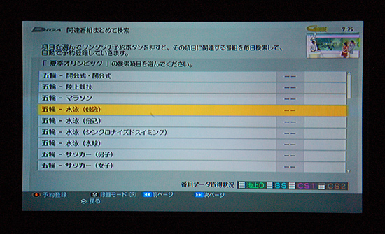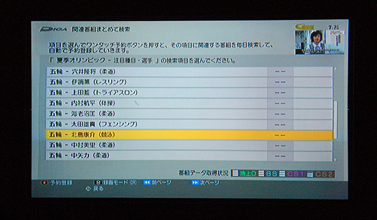 ディーガでは、スタートボタンから「関連番組まとめて検索」を選択することで、この「番組ラベル」機能を利用できる。「夏季オリンピック」を選ぶと、開会・閉会式を含む競技のリストを表示。「夏季オリンピック――注目種目・選手」では、話題の種目や選手名などを一覧表示する。これらをリモコンの「決定」ボタンで選択するだけで、観戦したい競技の中継や注目選手が出場する試合などを、まとめて簡単にチェックできる。
