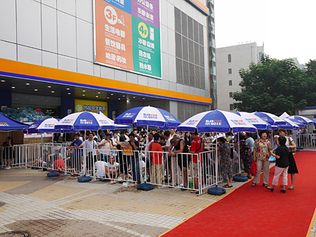 ラオックス(中国)の田叡総経理が「これまでよりも開店時の目玉商品を充実させた」というだけあって、店舗前広場には開店前から約1000人が行列をつくり、開店チラシを手に品定めをする姿が見られた。8時20分過ぎから開かれたオープニングセレモニーで、最初に挨拶に立ったラオックス(北京)の候総経理は、「日本の製品に加え、日本式サービスを中国の消費者に提供したい」として、「5つ星のサービスを目指す」と語った。候総経理によれば、「品揃えは家電製品が6~7割で日用雑貨などが3~4割。中国ではまだ珍しい高機能炊飯器や輸入の冷蔵庫なども取り扱う」という。さらに「待たないレジ、誠心誠意のサービス」などを目標に掲げた。
