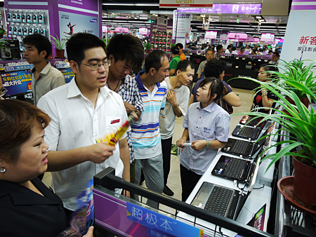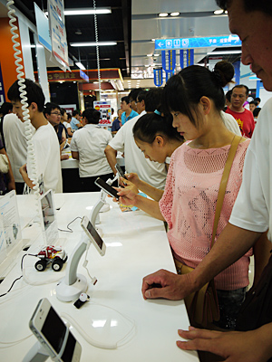 9時の開店と同時に行列していた客がなだれ込み、店内は一気に人で溢れかえった。開店から2時間あまりで約3000名が入店。開店時の勢いは、南京、上海を上回るもので、北京店への期待の大きさをうかがわせた。売り場構成は、1階がスマートフォンや携帯電話、デジタルカメラ、時計、アウトドア用品、文具、金製品など。2階がパソコンや薄型テレビ、オーディオ製品、楽器など。3階が生活家電や日用雑貨、玩具、キャラクター商品など、4階が温水器やエアコン、洗濯機などをそれぞれ取り扱う。