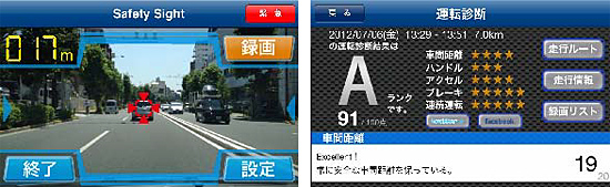 運転中の前方映像の解析(形状・大きさなど)によって、スマートフォンが前方車両との車間距離を認識し、前方車両の接近時や発進時に音で知らせる「前方車両接近アラート・前方車両発進お知らせ」機能を業界で初めて搭載。速度・急加速・急ブレーキ・車間距離などのデータを検知する「安全運転診断」、衝撃の前後数十秒、前方の映像を自動的に録画・保存する「ドライブレコーダー」などの機能を備える。