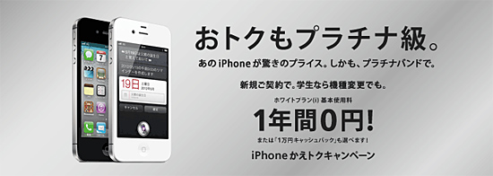 当初は6月15日から7月31日までの予定だったが、2か月延長する。キャンペーンの内容は、従来と同じ。期間中にiPhone 4S/4を新規契約で購入したユーザーとiPhone 4S/4に機種変更した学生を対象に、キャンペーン特典として、通常は月額980円の「ホワイトプラン(i)」の基本使用料を1年間無料にする。特典は、基本使用料無料ではなく、商品券(JCBギフトカード)による「1万円キャッシュバック」を選ぶこともできる。