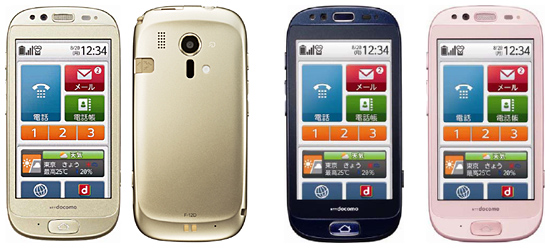 らくらくスマートフォン F-12D(左から、ゴールドの正面と背面、ネイビー、ピンク)