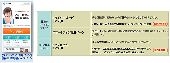 自動車保険の見積もりや申し込み、契約内容の変更がいつでもどこでも簡単にできるように、7月23日にスマートフォン専用ページを新設。7月27日には、ドライバーの安全運転意識向上をサポートするアプリ「ドライバーズナビ」に、ドライブレコーダー機能を追加した。スマートフォン向けアプリ「ドライバーズナビ」「トラブルナビ」ともに、ソニー損保の加入者だけでなく誰でも利用できる。