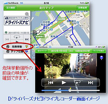 ドライブレコーダー機能は、安全運転診断時に、急ブレーキや急ハンドルなどの危険挙動があったときに、その前後の車両前方の映像を録画・保存することができる。診断終了後、運転したルートと危険挙動があった個所を地図上に表示し、自身の運転を振り返ることで安全運転技術の向上に生かす。