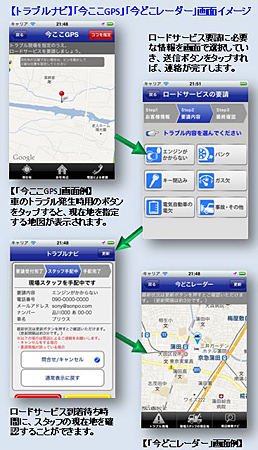 さらに、車の事故や故障などのトラブル時に「何をどのような順序で行えばよいか」「事故やトラブルの現場で記録しておくべき情報は何か」など、その場での的確な行動をナビゲートするアプリ「トラブルナビ」の新機能として、「今ここGPS」と「今どこレーダー」を、8月下旬に追加する。