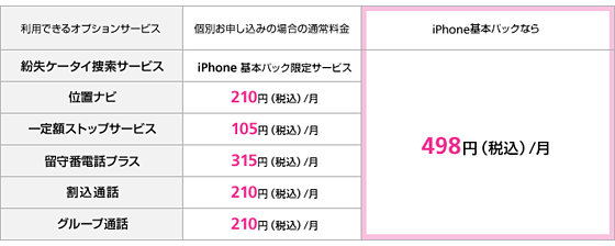 「留守番電話プラス」や「位置ナビ」「一定額ストップサービス」など、複数のオプションサービスをセットにした月額498円の「iPhone 基本パック」、または「iPhone 基本パック」に法人向けサービスを追加した「iPhone法人基本パック」(1回線につき月額498円)に加入すると利用できる。 「紛失ケータイ捜索サービス」は、「iPhone 基本パック」、Android搭載スマートフォン向け「スマートフォン基本パック」限定のサービスで、単体では利用できない。「iPhone 基本パック」「iPhone法人基本パック」の利用には申込みが必要で、iPhone購入と同時に新たに加入すれば、月額使用料が1か月無料になる。
