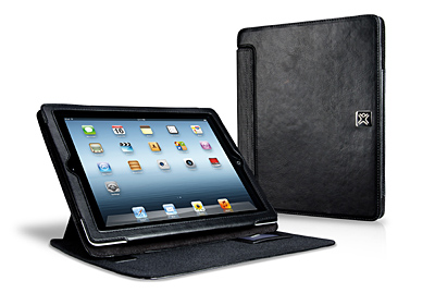 iPad用薄型フォリオケース「Micro Folio」は、超薄型の両面保護型モデル。材質はポリウレタンで、カーボンファイバー調にテクスチャード加工を施した。シーンに応じてiPadの向きを変えられるマルチアングルスタンドが付属し、フラップの内側にソフトなマイクロスエード加工を施すことで、キズやホコリ、汚れを防ぐ。