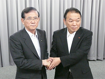 がっちりと握手するヤマダ電機の山田昇会長兼CEO(左)とベスト電器の小野浩司社長