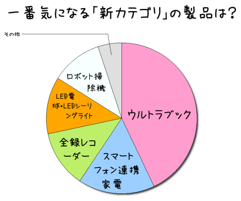 最初にお断りを。「1クリック投票」は、誰でも回数制限なく投票できる簡易アンケートです。厳密なアンケート調査結果ではありませんので、ご承知おきください。調査実施期間は6月6日~7月31日の約2か月間。今回は「一番気になる『新カテゴリ』の製品は?」をテーマに、これまでなかった新カテゴリのデジタル家電・生活家電として、「ウルトラブック」「全録レコーダー」「ロボット掃除機」「LED電球・LEDシーリングライト」「スマートフォン連携家電」をピックアップ。これらに「その他」を加えた六つの選択肢から選んでいただき、合計391票のご投票をいただきました。
