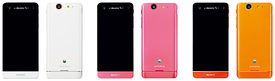 4色のカラーバリエーションを揃える軽量・コンパクトなXperia SX SO-05D(左から、ホワイト、ピンク、オレンジ)