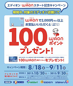 エディオン、イオンクレジットサービス、イオンの3社は、8月7日、エディオン店舗でイオンの電子マネー「WAON」での決済サービスを開始した。エディオンでは、これを記念して、8月18日~9月11日に対象のエディオン店舗で1回のレジ精算につき税込み2000円以上を「WAON」で支払うと、100WAONポイントをプレゼントするキャンペーンを実施する。