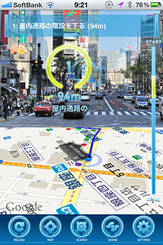目的地を指定し、iPhoneのカメラをかざすだけで目的地の方向がわかる。画面には、地図とカメラ映像を同時に表示し、ARタグで道順をナビゲートする。
