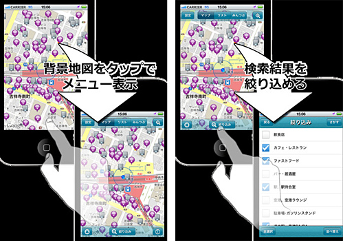 背景地図をタップするとメニューを表示。検索結果は、ジャンルで絞り込める。なお、「ソフトバンクWi-Fiスポット」を展開する承諾を受けて提供しているが、「ソフトバンクWi-Fiスポット」の公式アプリではない。