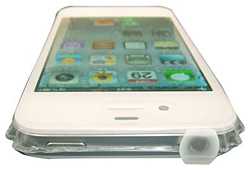 iPhone 4S/4本体にフィットする薄い素材を採用した防塵・防滴シート。iPhoneのデザインを変えることなく装着できる。コネクタとイヤホンジャック部分に装着した防塵・防滴キャップを外すだけで、シートを外さずに充電やイヤホンの着脱ができる。