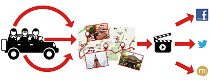 ドライブしているメンバー全員が撮影した写真を一つにまとめてムービーにするアプリ。写真、コメント、位置情報を一つにまとめ、計20種類のテンプレートとBGMを使って手軽に動画が作成できる。また、作成した動画やメンバーが撮影した写真は、SNS(ソーシャル・ネットワーキング・サービス)でシェアすることができる。
