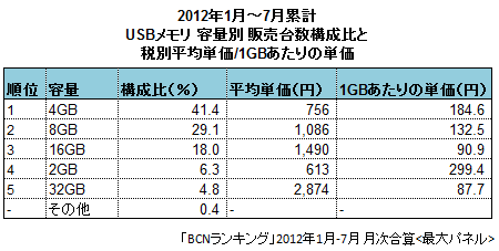 2012年1~7月の累計でのUSBメモリの税別平均単価(以下、すべて税別)は1098円。容量別に集計すると、4GBは756円、8GBは1086円、16GBは1490円、32GBは2874円、64GBは8294円で、32GBまでは、容量が大きいほうが1GBあたりの単価は安い。