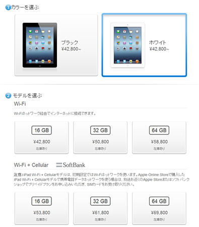 これまでオンラインのApple Storeでは、iPad、iPad 2、今年3月に発売した新iPad(第3世代iPad)とも、無線LANに対応したWi-Fiモデルしか販売しておらず、通信機能をもつモデルは、全国7店舗の直営店「Apple Store」やソフトバンクショップ、量販店などのiPad取扱店でしか購入できなかった。