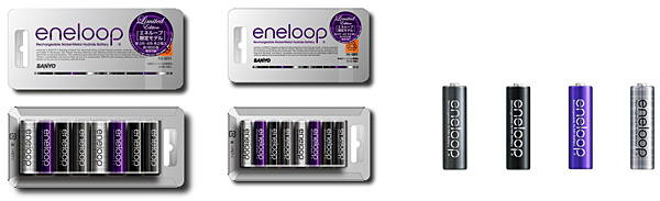 「エネループ トーンズ ウォモ」は、ダークグレーメタリック、オニキスブラック、ロイヤルパープルメタリック、シルバーメタリック・チェックの4色セット。単3形×8個(各色×2)「HR-3UTGB-8U」、単4形×8個(各色×2)「HR-4UTGB-8U」をラインアップする。