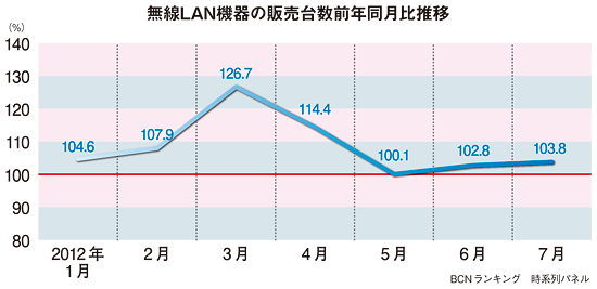 これらメーカー側の改善努力もあって、家電量販店の実売データを集計した「BCNランキング」で無線LAN機器の販売台数は、2010年7月以降、前年同月を上回って推移。家電量販店では、安定して収益が確保できる商材と位置づけているという。
