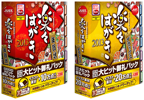 「楽々はがき 年賀状デザイン集2013」「楽々はがき デラックスデザイン集2013」はオンラインショップ「Just MyShop」のみの販売で、価格は「楽々はがき 年賀状デザイン集2013」が2625円、「楽々はがき デラックスデザイン集2013」が3360円。