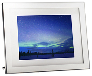 8インチの液晶モニタ(解像度800×600)を搭載し、写真をスケッチ、モノクロ、セピア風にアレンジして表示する「カラー効果機能」や、17種類のスライドショーパターンを備える。