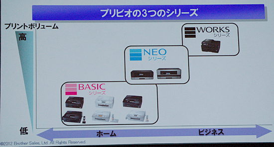 今後は、印刷数が少ない家庭向けは「BASIC」、印刷数が多いビジネス向けは「WORKS」、「BASIC」と「WORKS」の間にさまざまな新機能を搭載した「NEO」を置き、3シリーズで展開していく。