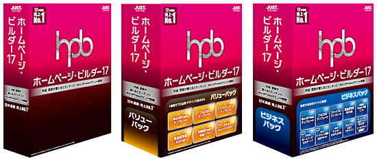左から「ホームページ・ビルダー17」の「通常版」「通常版 バリューパック」「通常版 ビジネスパック」