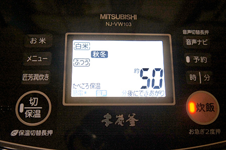 次に「季節炊き」の「秋冬」モードで炊いた。今は夏だが、早稲の新米を購入したので、あえて「秋冬」を選択した。同じように2合を炊いて、炊き上がりまでにかかった時間は50分。