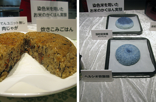 炊き込みごはん(左)は、具がよく混ざっていることがわかる。右は白米の下に色づけした米を入れて炊いた「お米のかくはん実験」による従来製品との比較