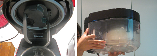 「かいてんユニット」(左)は、洗米や浸し、加熱時はウイングを広げ、沸騰後の泡切り時は閉じて回転する。洗米時は30~60秒程度で約150回転してお米を洗う