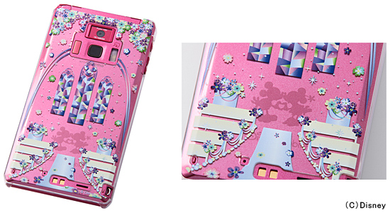 「チャペル」は、ミッキーたちのシルエット部分は透明なまま、その周辺にチャペルの内装を幻想的に、きらびやかにデザイン。「F-08D」に装着するとミッキーと、ミニーの結婚式のシーンに早変わりする。