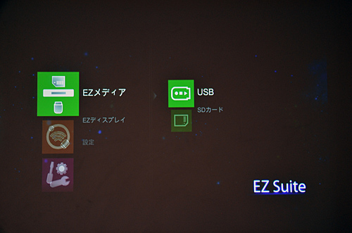 PCを使わずに本体のビューワ機能を利用したい場合は、操作メニューの「EZメディア」から「USB」または「SDカード」を選択