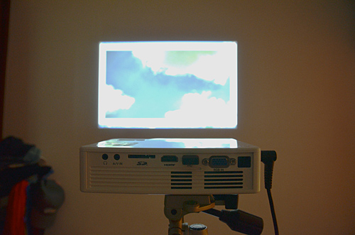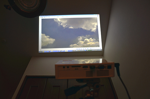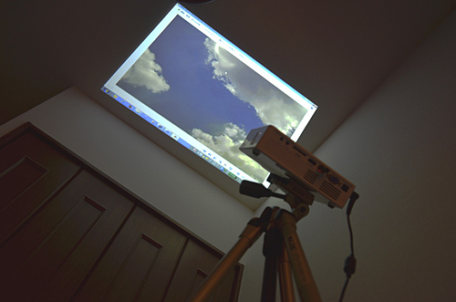 クローゼットの上の天井に、青空の写真を投映した。カメラ用の三脚を使えば、こんな角度での投映もまったく問題ない