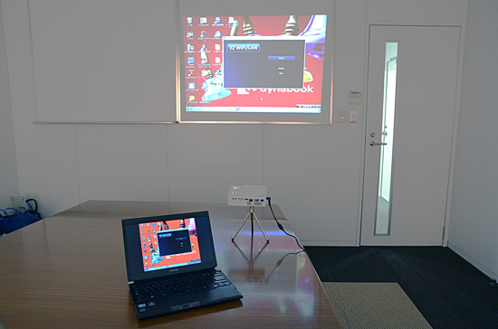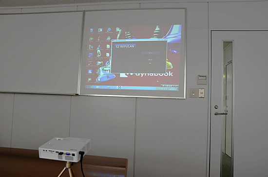 PCとワイヤレスで接続。ケーブルでつながっていないのに、PC画面と同じ映像がミラーリングで投映できている。ワイヤレスだとスマートに使える