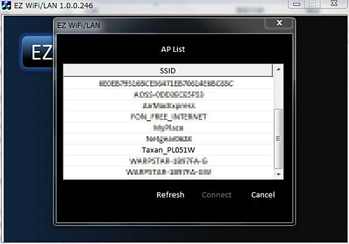 専用ソフト「EZ WiFi/LAN」を起動すると、ワイヤレスアクセスポイントの一覧のなかの「TAXAN_PL051W」を選択すればワイヤレス接続が確立されて自動的にミラーリング表示に切り替わる