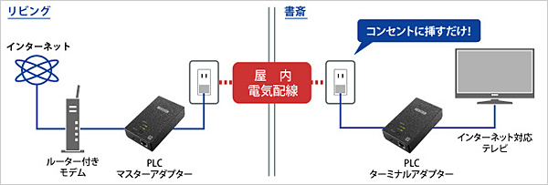 安定性や通信速度、省電力性能を向上した第3世代HD-PLCアダプタ。家庭のコンセント内の電気配線でネットワーク通信ができるので、無線LANの届きにくい場所でも、コンセントがあれば安定してネットワークに接続できる。接続できるネットワーク機器の台数は、マスターアダプタ、ターミナルアダプタそれぞれ最大8台(推奨値)。