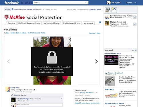 自分の写真へのアクセスを許可する友人を選択することができ、アクセスを許された友人は「McAfee Social Protection」をインストールすることで、写真を正しく表示できる。