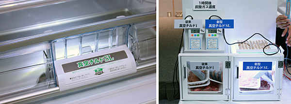 この炭酸ガスを「真空チルドルーム」内に保つことでガスが働き、生鮮食品の活性作用が減少し、「眠らせる」ように保存。肉や魚の表面が弱酸性になり、酸素の働きを抑えてタンパク質の酸化を抑える。また、生鮮野菜は、炭酸ガスに反応して気孔を閉じるために呼吸量が減り、栄養素の消費が抑えられる。