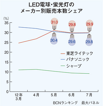 メーカー各社は、昨年から今年にかけて新製品を相次いで発売。シェア争いも過熱している。家電量販店の実売データを集計した「BCNランキング」によれば、今年4月までメーカー別販売本数シェアでパナソニックがトップを維持していたが、5月からは東芝ライテックがトップに立っている。LED電球「E-CORE」シリーズで、昨年3月に発売した「LDA6N/3」が平均単価700円台と安く、機種別販売本数シェアでトップを維持していることが寄与している。