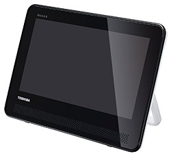 液晶ディスプレイの解像度は、1024×600ピクセル。サイズは、270×199×46mmで、重さは1.6kg。内蔵バッテリは、約5時間のテレビ視聴やDVD連続再生に対応する。「節電モード」にすることで、約7時間まで連続再生時間することができる。スタンドは視聴角度調整のほか、180°回転させることでハンドルとしても利用できる。